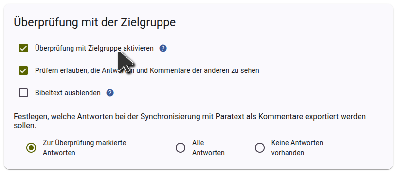 Wenn das Projekt noch nicht mit Scripture Forge verbunden ist, verbinde das Projekt und lass das Kontrollkästchen Überprüfung mit der Zielgruppe aktivieren angekreuzt.