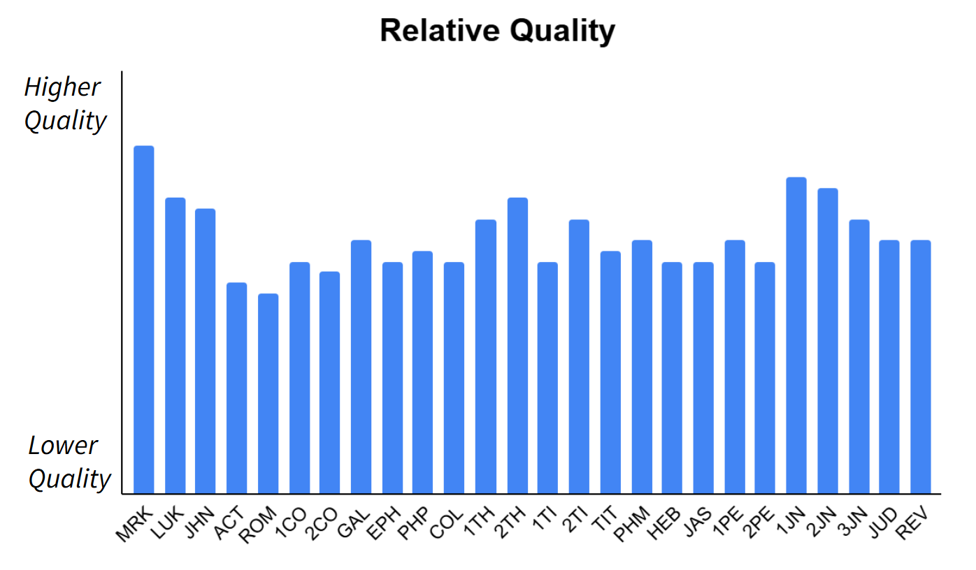 With the introduction of New Testament draft generation, Scripture Forge has developed a method of estimating the quality of the generated draft. Book-level draft quality can be used as a guide for strategic decisions regarding book sequencing. Chapter-level draft quality can be used to evaluate the need for incremental draft generation, or to anticipate the time needed for editing, improvement, and checking. It is important to understand these values as draft quality estimates, and use them for general insights and guidance, rather than as quality checking tools.