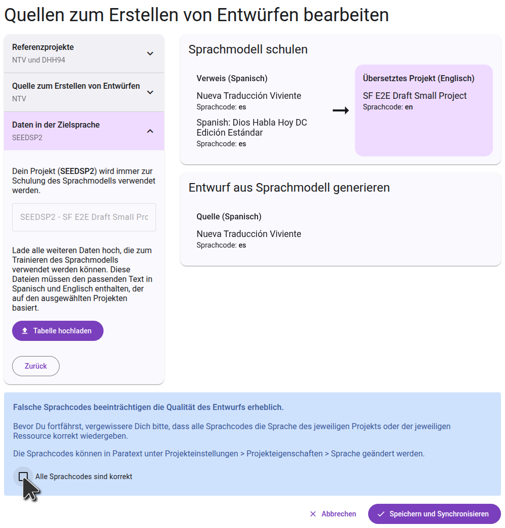 Im letzten Schritt werden die Daten in der Zielsprache angezeigt. Dazu gehört immer auch Dein Projekt selbst, das bereits ausgewählt ist und nicht entfernt werden kann. Du kannst in diesem Schritt zusätzliche Schulungsdaten hinzufügen, indem Du ein Arbeitsblatt mit gepaarten Daten hochlädst, wobei die Ausgangssprache in der ersten Spalte und die Zielsprache in der zweiten Spalte steht.