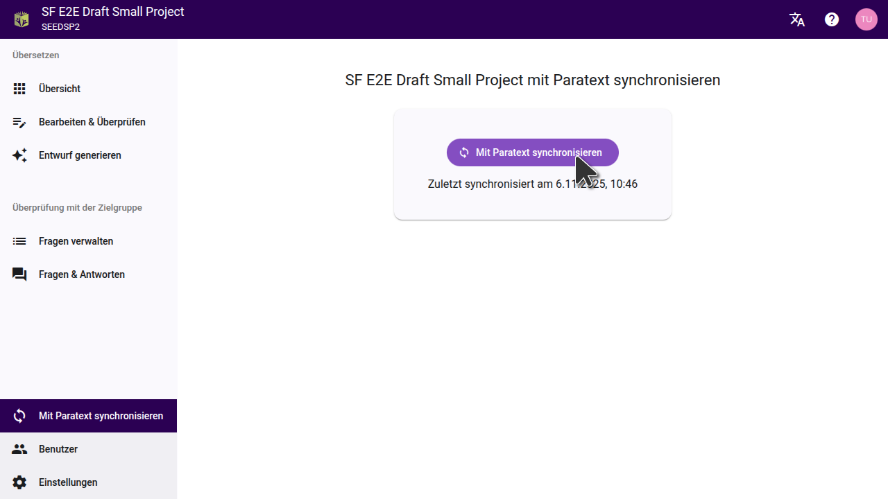 Um ein Projekt zu synchronisieren, klicke auf Synchronisieren mit Paratext im Hauptnavigationsmenü. Klicke dann auf die Schaltfläche Synchronisieren mit Paratext wie unten beschrieben. Der Fortschritt wird während der Synchronisierung angezeigt, die in der Regel 1 bis 3 Minuten dauert, je nach Größe des Projekts.