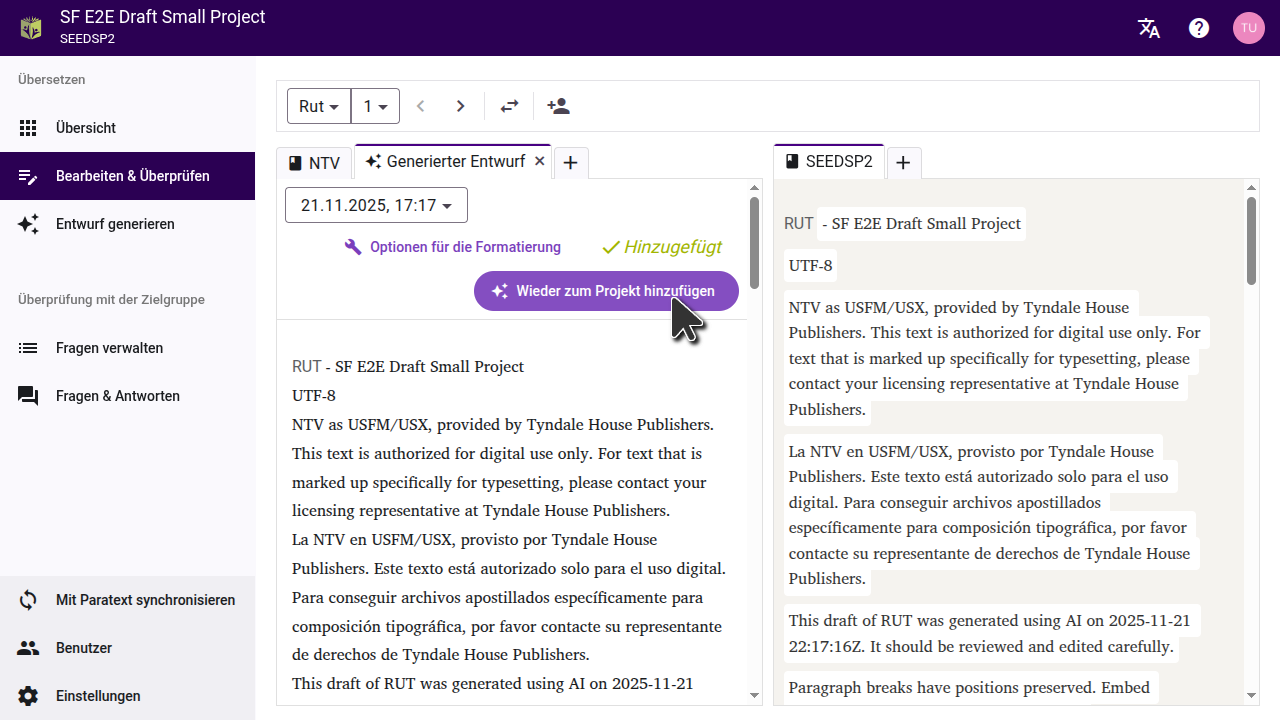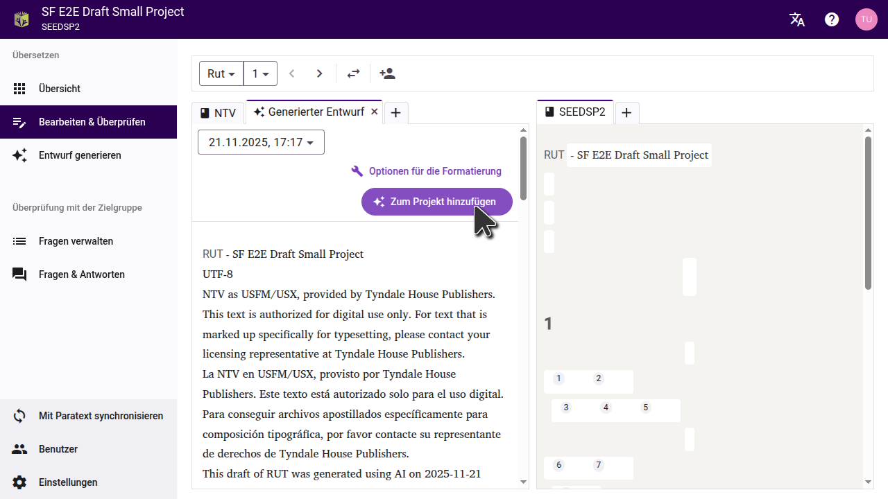 Falls Du den Entwurf nicht direkt in Dein Projekt importieren möchtest, kannst Du den Entwurf auch als USFM-Dateien herunterladen. Klicke auf der Seite "Entwurf generieren" auf "Entwurf herunterladen" und entpacke die Dateien auf Deinem Computer. Du kannst diese Dateien dann in ein Projekt in Paratext importieren.