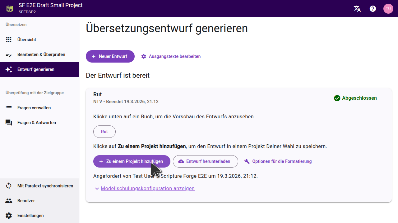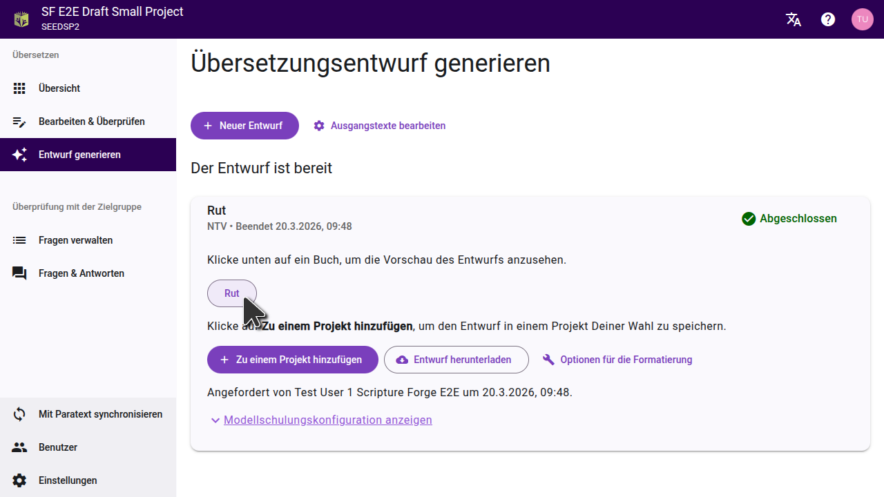 Scripture Forge zeigt an, wenn Dein Entwurf fertig ist und listet die Bücher auf, die erstellt wurden. Generierte Entwürfe werden nicht automatisch in Dein Projekt importiert. Aus Entwürfe Generieren kannst Du eine Voransicht öffnen oder Entwürfe importieren.