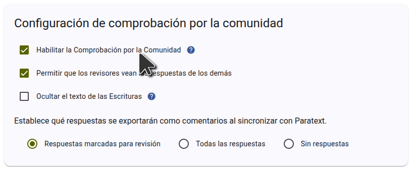 Si el proyecto aún no se ha conectado a Scripture Forge, conecta el proyecto y mantén marcada la casilla Activar comprobación comunitaria.