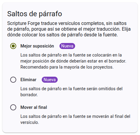 Hay tres opciones para los saltos de párrafo. El valor por defecto es "mejor estimación", lo que se recomienda para la mayoría de los proyectos. Cuando seleccione una opción, una vista previa se muestra en el lado derecho de la página para ayudarle a entender cómo las opciones afectarán el formato de su borrador.
