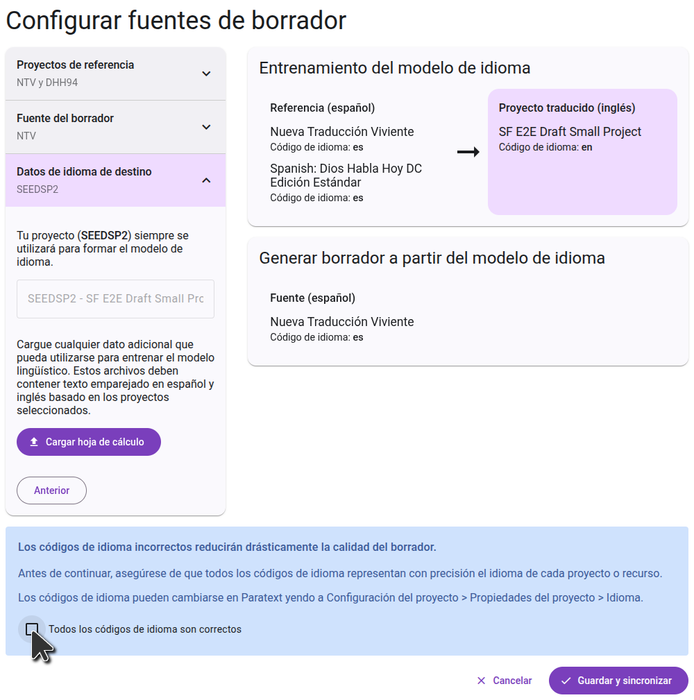 El paso final muestra los datos del idioma de destino. Esto incluirá siempre su propio proyecto, que ya está seleccionado y no puede eliminarse. Puede añadir datos de entrenamiento adicionales en este paso cargando una hoja de cálculo con datos emparejados, con el idioma de fuente en la primera columna y el idioma de destino en la segunda.