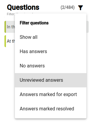 Si vous souhaitez trouver des réponses qui n'ont pas été marquées pour l'exportation ou qui ont été marquées comme résolues, utilisez le filtre au-dessus de la liste des questions pour trouver Réponses non examinées.