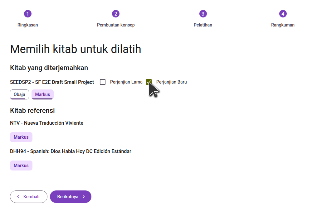 On the next step, select the books to use to train the language model, both in your main project, and in the reference projects. Choose all the books in your project that have been adequately reviewed. While they don't need to be consultant-checked, they should be accurate translations of the source book.