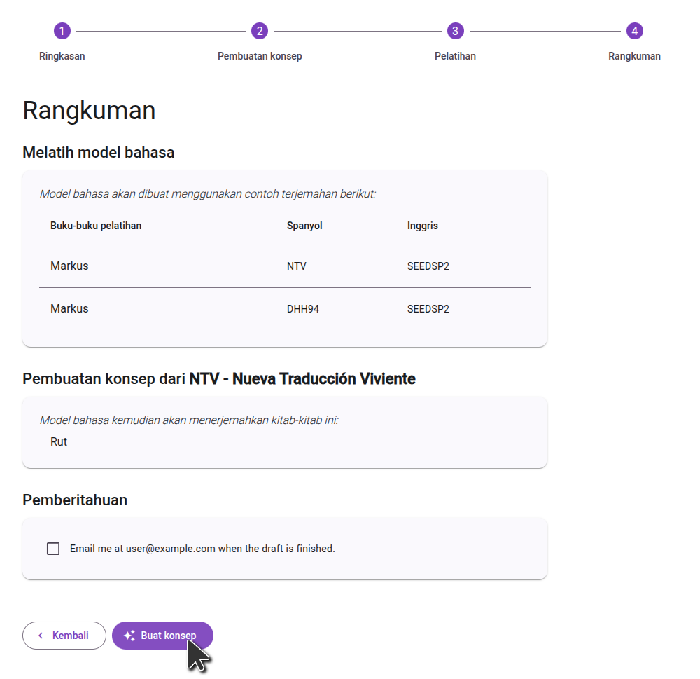 On the final step, review the books you selected to train the model, and the books you selected to draft. If you need to make any changes, you can go to the previous steps. Once you are happy with your selections, click the "Generate Draft" button to start the process.