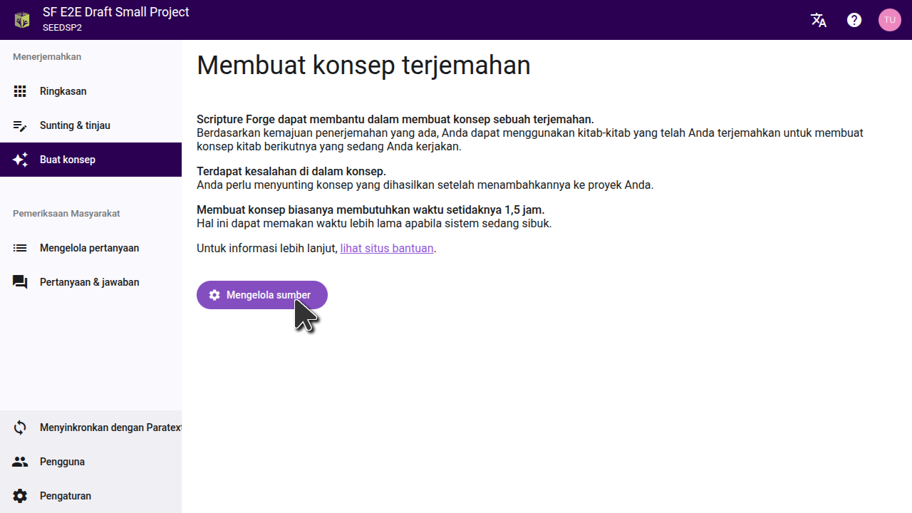 After you fill out the form, the Scripture Forge onboarding team will review your request and work to find the best settings for your project. You will be provided with one or more drafts to review. If you decide that generating drafts is right for your project, the team will enable drafting on your project and guide you through the process of selecting the settings that were found to be best.