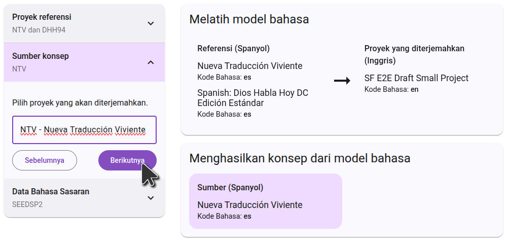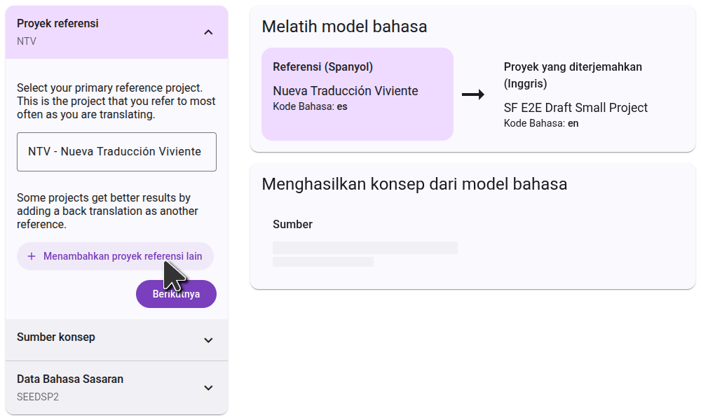 On the right side, you will see a diagram of how the projects you selected will be used to generate the draft. In the first step, the language model will learn by comparing the reference projects to the translated project. In the second step, it will use that knowledge to translate the source project.