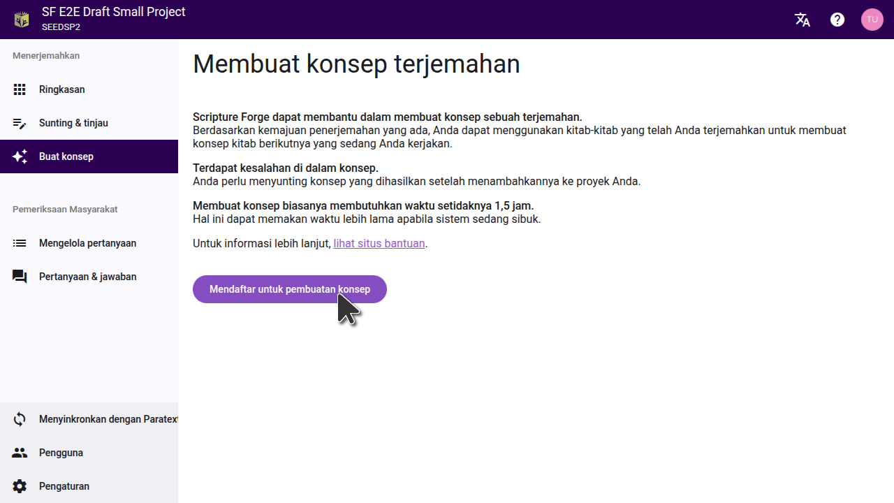 To generate drafts in Scripture Forge, click on the "Generate Draft" button in the main menu. Then click the "Sign up for Drafting" button, and fill out the form that opens, to get access for your project. Back translation projects are enabled by default and do not need to fill out the form.