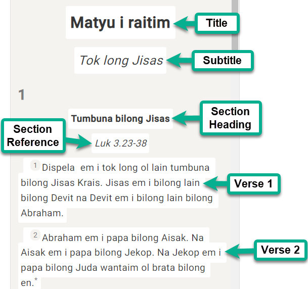 For example, the following passage has 6 segments (Title, Section Heading, Verse 1, etc):