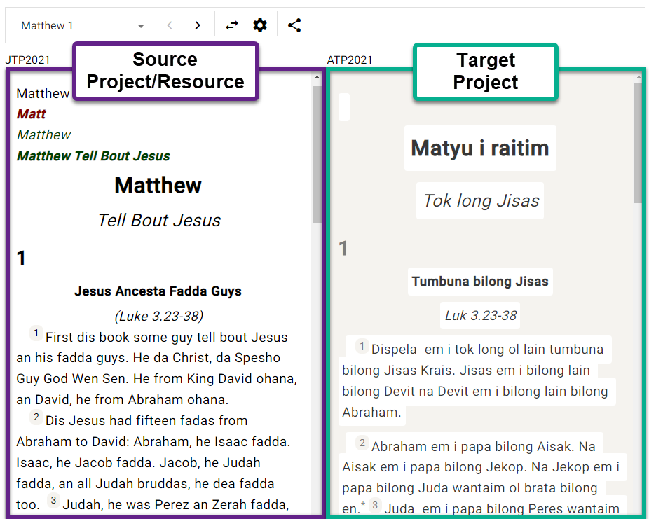 - Translation suggestions are based on Scripture Forge analyzing verses in the target project that have already been translated from the source project.